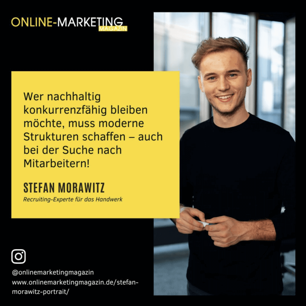 Im Interview mit dem ONLINE-MARKETING MAGAZIN spricht Stefan Morawitz darüber, warum die meisten Handwerksbetriebe über die herkömmlichen Wege keine qualitativen Bewerber mehr erhalten. Wie die Lösung dafür in der Praxis aussieht und welche Maßnahmen dabei umgesetzt werden, erfahren Sie im Artikel.